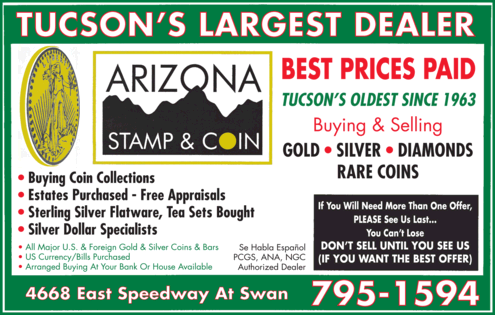 Arizona Stamp & Coin is a locally owned and operated shop that offers buying and selling of coins. We also offer jewelry and watch repair services. We believe in paying a fair price for all of your valuables. Our mission is complete customer satisfaction! Whether you are coming into the store to get a price on an item you would like to sell or you are a collector looking to purchase an item we are here to help you out. We have served the Tucson community since 1963. Put our expertise to the test, you will not be disappointed. Stop by our shop or call us (520) 795-1594 for more information.